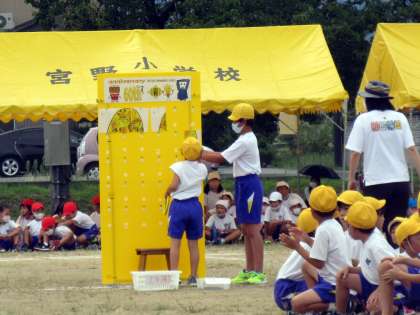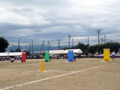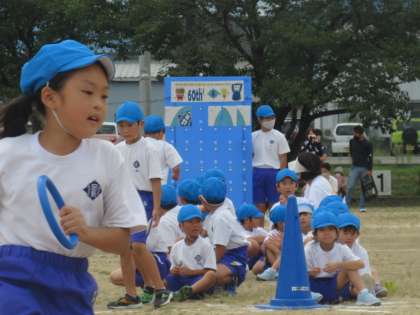 低学年の「60周年競技」は、折り返しリレーをしながら、はやく60周年記念ボードを完成させるリレー。