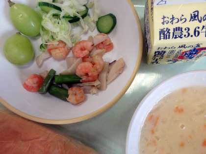今日は、黄緑色をした大粒のぶどうが給食に出ています。