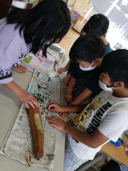 収穫したヘチマは、乾燥して「たわし」ができ始めているようです。中からは種がこぼれ始めました。「ヘチマ、ただ腐るだけかと思っていたら、すごい!」子供たちから、感嘆の声が上がりました。休校で種を植えることができなかった子供たち(担任で植えました)は、「春になったら植えてみる。」と、一人一粒ずつ大切に持ち帰りました。