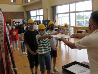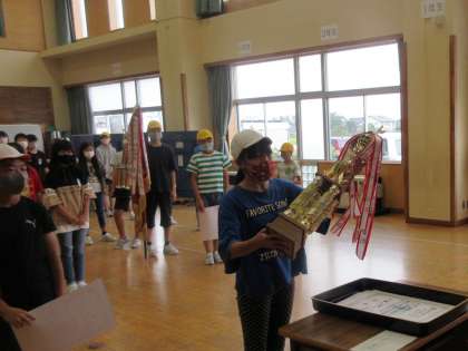 高学年リレー優勝の黄団には、それぞれ、賞状とトロフィーが授与されました。