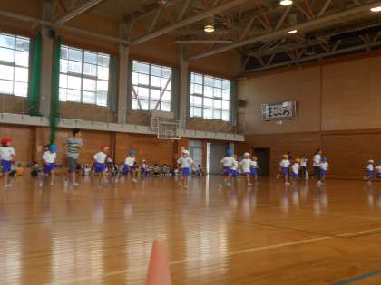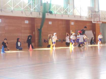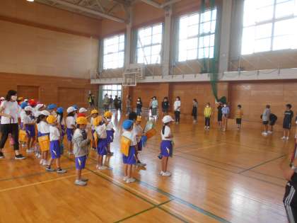 1年生が初めてシャトルランを走るということで、6年生が回数を計測するお手伝いをしました。