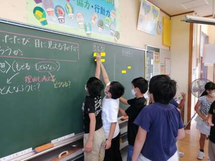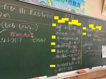 先日の理科では、水が水蒸気になって蒸発することを実験で確かめて学びました。今日は「水じょう気は、ふたたび目に見える形にもどるのだろうか?」ということについて予想しました。子供たちは、社会科の水の学習や、日常の経験や事象の中から、想像力を働かせて真剣に考えを出し合いました。「もどる?もどらない?」…後日、実験で確かめます。予想は合っていても合っていなくてもいいんです。共通の課題(?)について、みんなで一生懸命考え話し合えたことに意味があるのです。「あー、楽しかった!」これからも、子供たちが時間を忘れて話し合えるような、そんな授業を組み立てていきます。