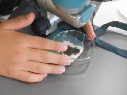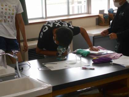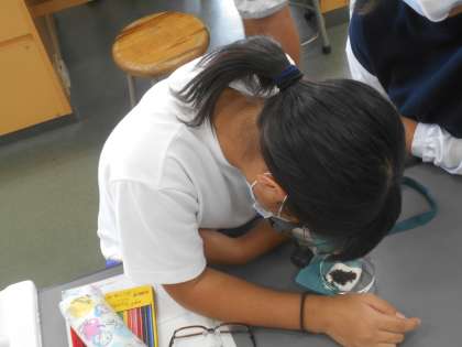 6年生の理科は、地層の学習を行っています。今日は、顕微鏡で火山灰を観察しました。