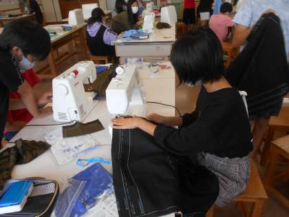 約1年ぶりにミシンを使いました。使い方をきちんと覚えている子供たちが多く、分からないところは、協力し合って進めていました。