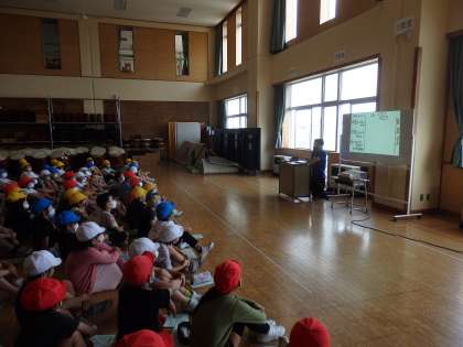 今日は3,4年生合同で、牛岳登山についてのお話を聞きました。