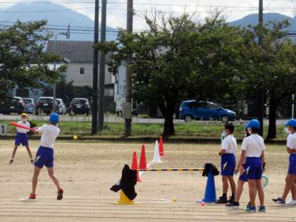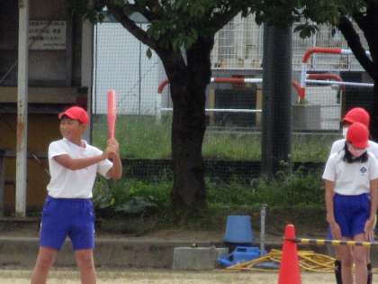グラウンドで、ベースボール型のゲーム。 青空の下で球音が響きます