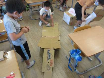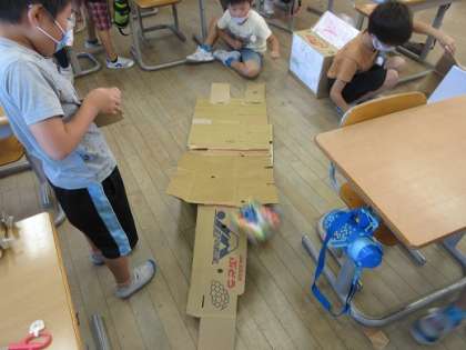 スタントカーチームの制作場面です。1年生により楽しんでもらうために大きなコースを作り、さらに坂をつけて難しくしています。自分たちでも試しながら制作中です。
