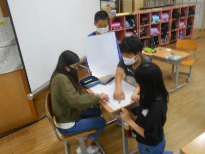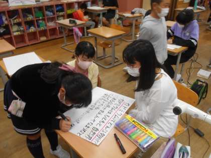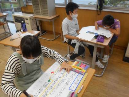 総合的な学習の時間に各自で調べていたことの発表準備を行いました。同じテーマで調べていた子供たちがグループを組んで、協力して活動していました。
