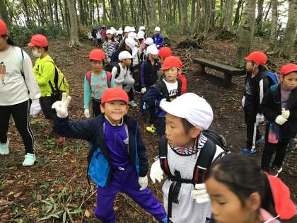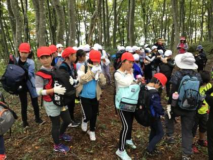 山道の中間地点で休憩です。 まだまだ、みんな元気です。