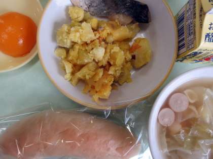 今日は「チーズおさつ」が給食に出ています。材料は、さつまいもとチーズです。