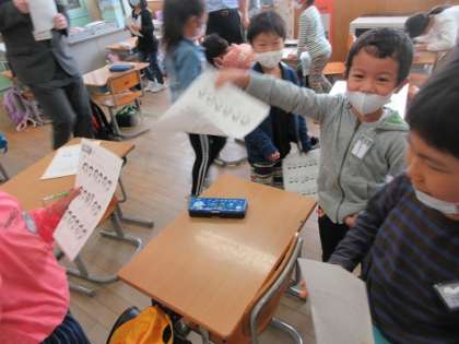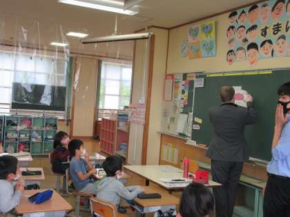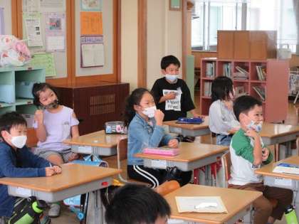2年生になって初めての外国語の学習をしました。挨拶と色の名前を覚えました。普段やっていない外国語の授業は新鮮で、とても楽しそうでした。