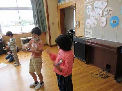 2拍子のリズムの学習です。歌いながら、楽器をリズムよく叩く、、、、簡単そうで子供たちにとっては難しいチャレンジです。グループごとに練習しています。