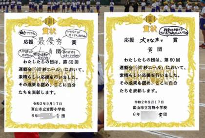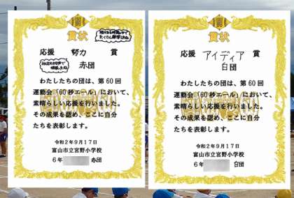 上の画像は、6年生が自分たちの団におくった賞状です。(今年度は応援合戦がなかったので、子供たちが自分たちの応援を自己評価しました)
