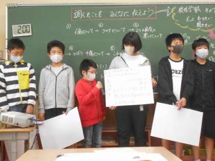 この5つのグループの発表を聞きました。今後、県のイタイイタイ病資料館や清流会館の見学を控える6年生です。今日気づいたことや、もっと知りたいことなど、課題意識をもって見学に行き、自分たちなりの答えを考えていきます。