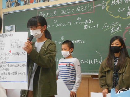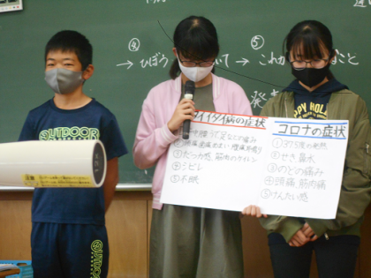 同じことを繰り返さないために、新しい生活様式を提案しようと総合的な学習の時間の学習を進めています。