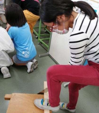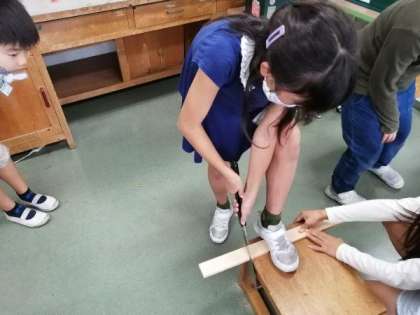 図画工作科の学習で、木材を切ったり釘を打ったりして、「玉転がしゲーム」をつくります。今日は、のこぎりの使い方を学習しました。「足でしっかり押さえること、切り始めと切り終わりはゆっくりと」など、約束を守って安全に活動することができました。「そんなに力を入れなくても切れるんだね」「思ったより、簡単だったよ」新しいことを、また1つできるようになった子供たちは、とても嬉しそうな表情をしています。