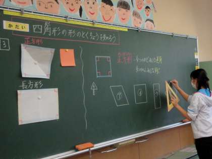 三角定規を使って直角を確かめています。