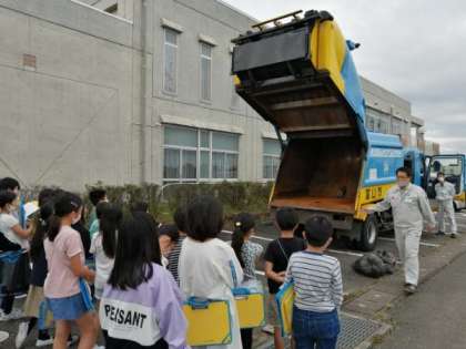 富山市環境センター事業の「3R推進スクール」を実施しました。3つのRについて説明を聞き、実際にパッカー車(ごみ収集車)やリサイクル製品を見せてもらいました。子供たちは、ごみを積んでから捨てるまでのパッカー車の動きを、驚きながら真剣に見ていました。やはり、実物を見ることは、大きな学習効果につながりますね。