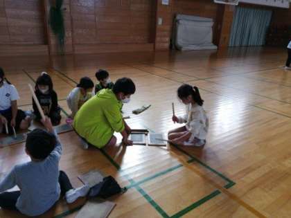 和太鼓げんキッズ活動。6年生が下級生に、あの手この手で優しく教えています。自分たちも先輩から教えてもらったからこそできること。こうやって、宮野小学校のの伝統が、温かいバトンでつながれていくのです。