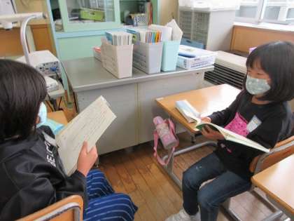 国語科「お手紙」の学習です。かえるくんとがまくんの気持ちを考えて、音読の仕方を工夫しています。