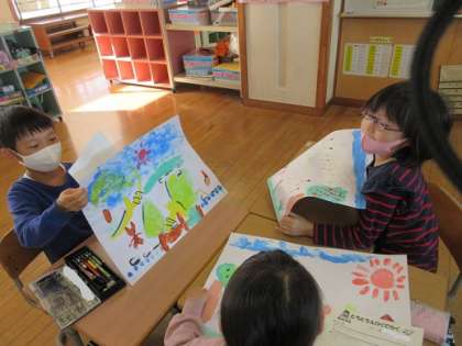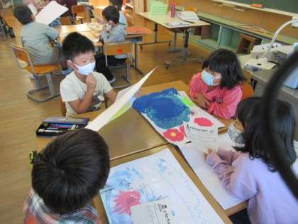 「とろとろえのぐでかく」の学習でつくった作品を、友達と見せ合いました。自分の作品のよいところも友達の作品のよいところも見つけ合いました。