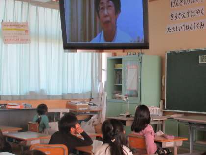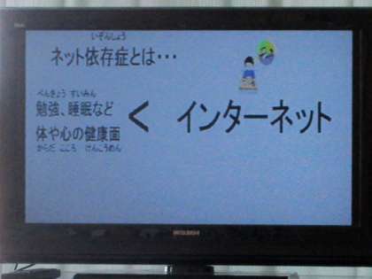 保健委員会が、本校の子供たちのネットの実態を調べ、発表を行った後、学校医の青島先生が、ネット依存についてビデオ講演をしてくださいました。保護者代表としてPTA会長にも参加していただき、親の立場でも子供たちに話をしてもらいました。