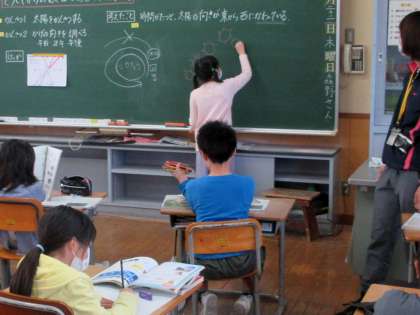自分の考えを、黒板に図を書いて説明しています。
