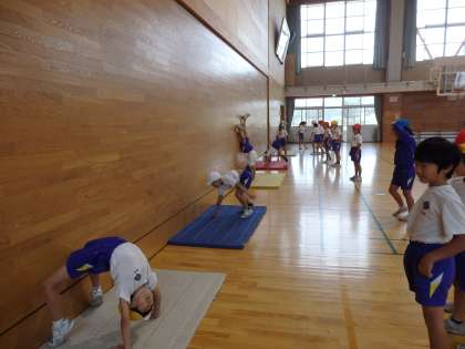 友達同士で「もっと手を前についたらいいよ」「足を高くあげたらいいよ」などアドバイスをしたり、できたね!と一緒に喜んだりする姿が見られ、とっても素敵できた。