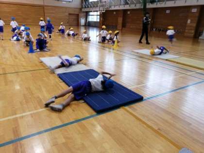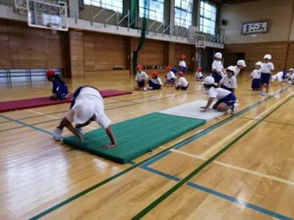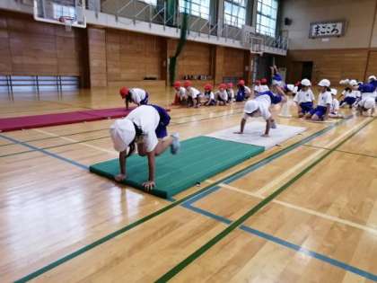 マットを使って、鉛筆転がり、カエルの足打ち、川跳び等を行いました。マットに体をつけて転がったり、手で体を支えて逆立ちをしたりする運動遊びは、今後、中・高学年で行うマット運動につながる大切な動きです。ご家庭でも、お子さんと、体を回転させたり支えたりする遊びを積極的に行ってくださると助かります。
