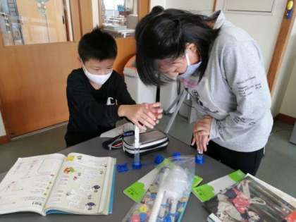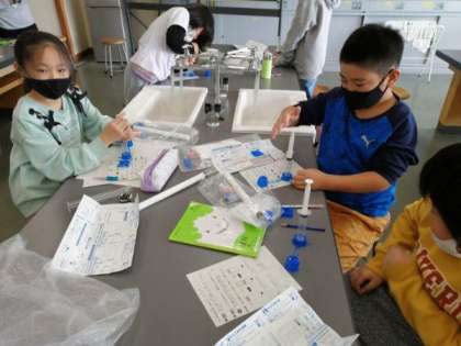 「つぶれるんじゃない?」「はね返すんじゃない?」「かたくなるんじゃない?」一人一人が予想を立てて注射器に閉じ込めた空気の実験に取り組みました。「これ以上、おせませーん!」たくさんの声が聞こえてきました。少しずつ、空気の性質について分かり始めた子供たち…次は、空気の性質をもっと見付けるために、空気でっぽうで実験することを楽しみにしています。