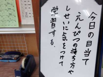 5年生の今日のめあてに「姿勢と鉛筆の持ち方」が書いてありました。