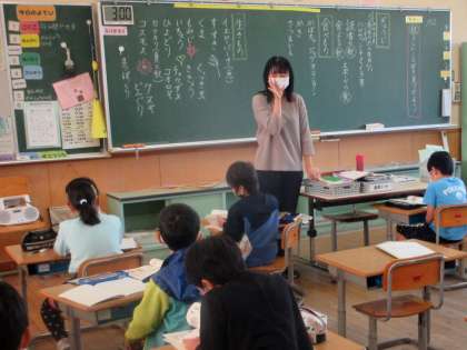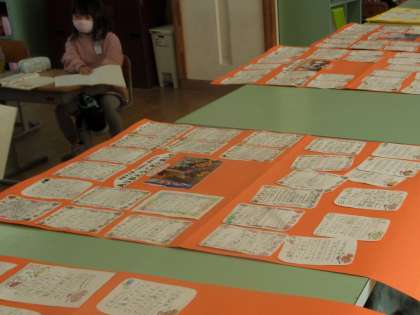 まち探検のお礼の手紙を貼った大きな用紙を準備中。
