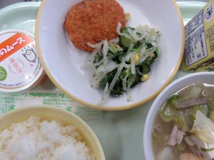 給食で使われている富山県産の食べ物は、米、小松菜、だいこん、水菜、えごま、はくさい、ねぎ、米粉(富富富)、牛乳です。