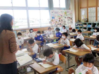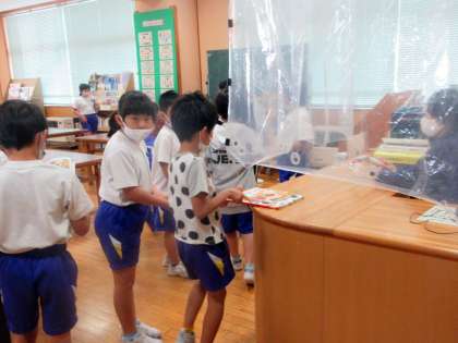 1組の子供たちが、借りた本を返しに図書室に行きました。