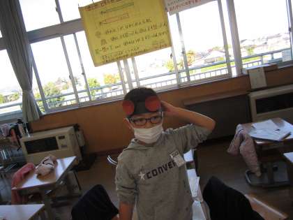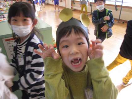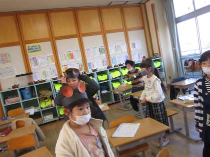 学習発表会の準備を進める1年生。なんと、こぐまに変身してしまった児童が続出です。