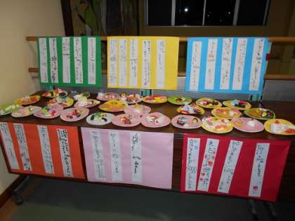 また、図画工作では、「みやの小学校60周年おめでとう」シリーズで、お祝いの食べ物を作りました。一人一人メニュー表も作りました。