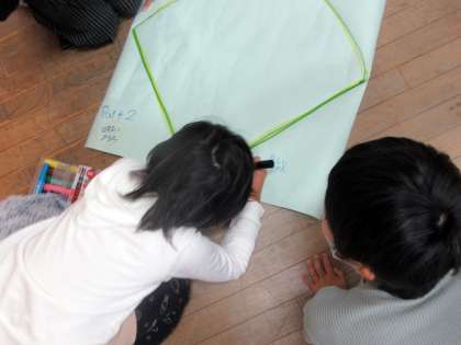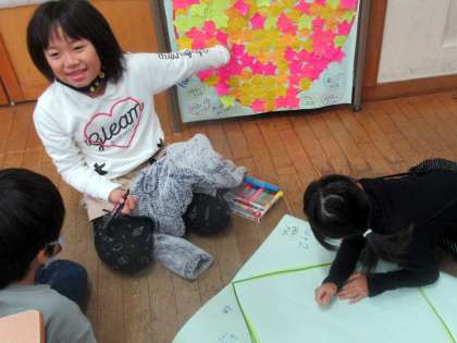 3年生の係がすすめている、やさしさハートの1枚目が満開になったので、2枚目の用紙を製作中。今度はダイヤの形です。
