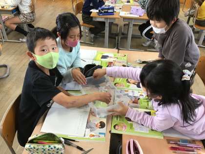 輪ゴムを弾いたり、紙笛を吹いたりしながら音が出る秘密を調べました。