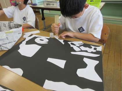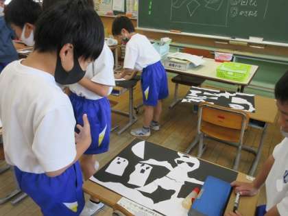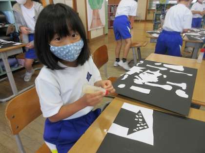 切った形から想像し、並べて作品を作りました。「これおばけに見えるんだよ!」「これは足なんだよ」と自分たちに見えている形を説明してくれました。