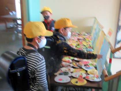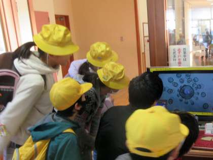 2階の会議室前に、飾ってある1年生の図工作品の周りにも子供たちがさくさんいます。