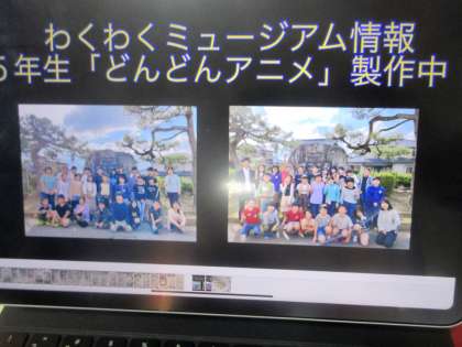 5年生が図工の時間に製作中の「くるくるアニメ」の途中作品を上映中。