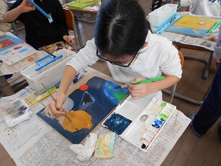 玉転がしゲームの作成をしました。初めてののこぎりに挑戦しました。また、楽しくなるように板に色を塗りました。