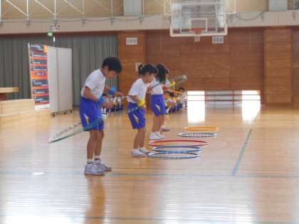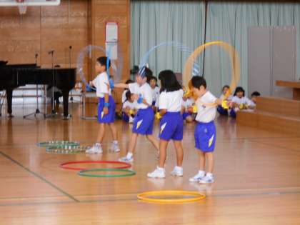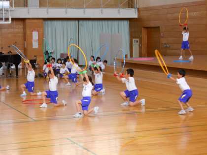 フラフープチームです。落とさないように何度も練習して技を磨きました。