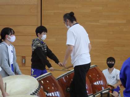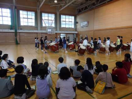 今日は、講師の先生がいらっしゃって、5,6年生がそれぞれ和太鼓活動をしていました。総合の学習と結びつけ、今日はその様子を3年生も見学しました。