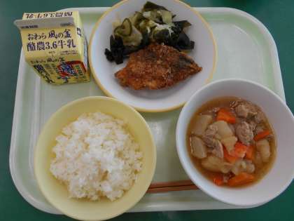 ご飯、さばの竜田揚げ、酢の物、豚肉の炒め煮、牛乳でした。