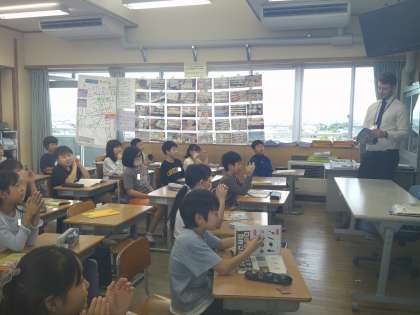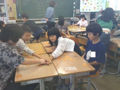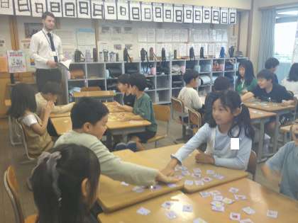 子供たちはALTの話されることをよく聞き、グループの友達と一緒に、夢中になって答えの札を探していました。