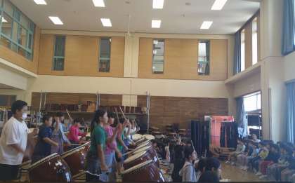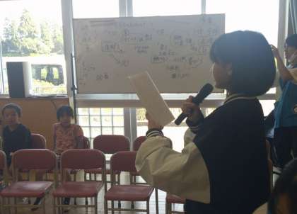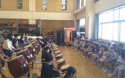 今日は宮野保育所の年長さんが宮野小学校に遊びに来ました。まずは、学習発表会でも披露する大地・大祭を聞いてもらいました。「すごかった」「音が怖かった」などと年長さんも演奏を楽しんでいました。