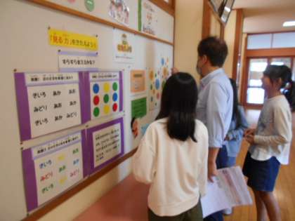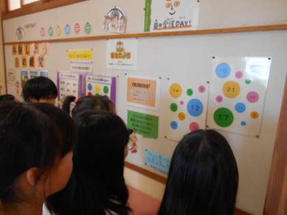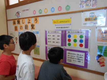 今月の保健コーナーを楽しそうに見ています。とても役立つ掲示です。