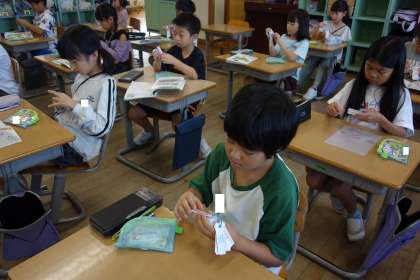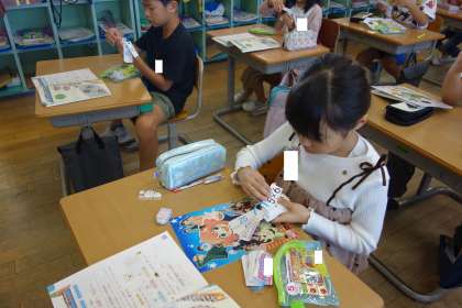 九九カードを利用して、九九の練習をしています。家庭学習でも九九カードを利用します。家でも何度も聞いてあげてください。
