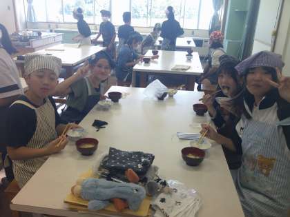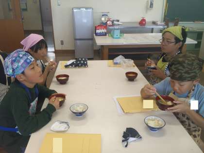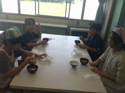 みんなで役割分担し、協力してつくったご飯とみそ汁は、格別に美味しかったようです。美味しい笑顔が広がりました。